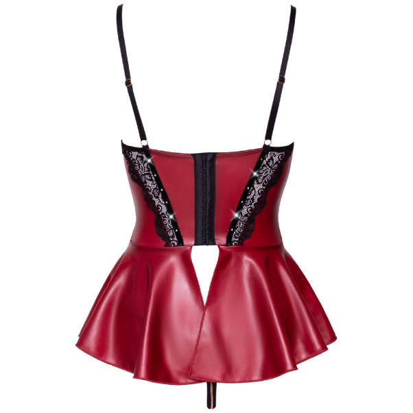 The longline bra features a row of clasps in the back to firmly secure the piece. Opaque red and sheer lace mix in erotic perfection with rhinestone decorations providing a sparkling touch. Supported with light padding in the underwired cups, your breasts are beautifully framed with detachable chains.
