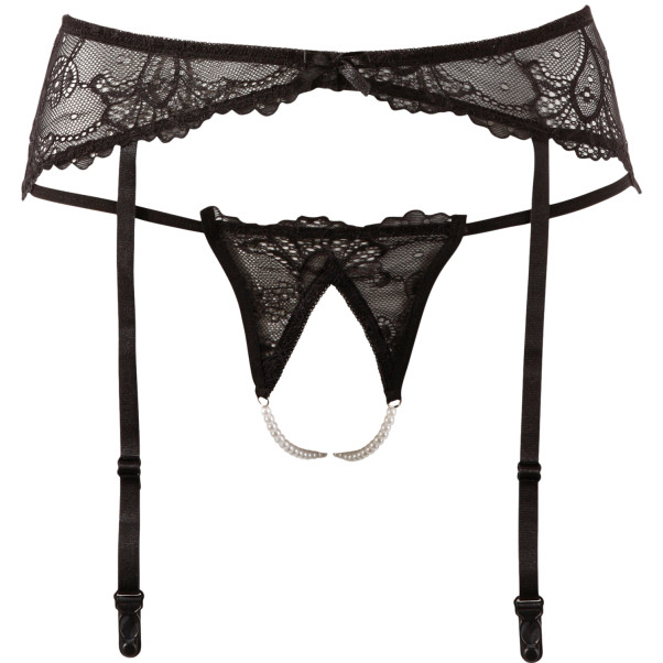 A G-string in matching black lace comes included. The front is open with two pearl chains for an alluring crotchless effect.