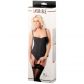 A black lace string covers your essentials. Attach the adjustable suspender straps to the included lace-edged stockings before you take the catwalk and stun your lucky lover!