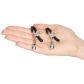 CONTAINS: Flogger, wrist cuff set with chain, collar, ball gag, blindfold, leash, rope, nipple clamp set with bells.