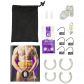CONTENT: Penis cage, 5 U-rings of different sizes (+ 1 top ring), 3 spacers and lock pins of different sizes, metal padlock with 2 keys, 5 individually numbered plastic locks, 10 ml lube, storage pouch.