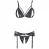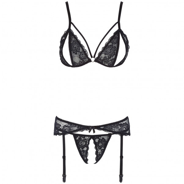THE SET CONTAINS: Peekaboo bra, suspender belt and crotchless G-string.
