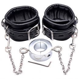 When it’s time to bring your slave to his knees, the appropriately named Hell’s Tether from Master Series is ready to serve. Attach the heavy ball stretcher around his jewels and the black cuffs around his ankles, and when you snap the metal chains in place to connect the two, he has no choice but to learn humility.
