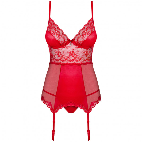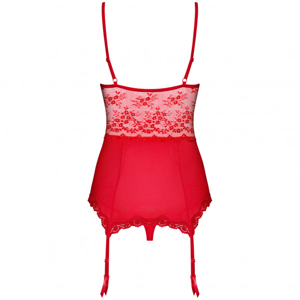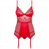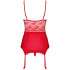 The set includes a chemise made from a red, soft and lightly transparent material for a discreet glimpse in underneath. The red lace adorns the cups under the bust and the hem at the bottom, framing and highlighting your beautiful bum.