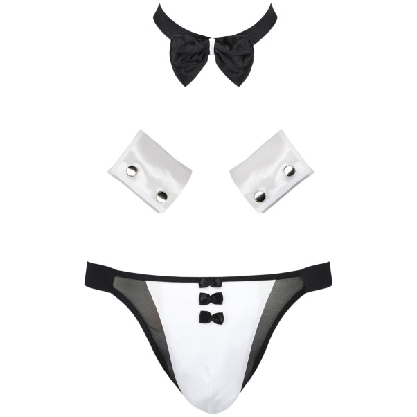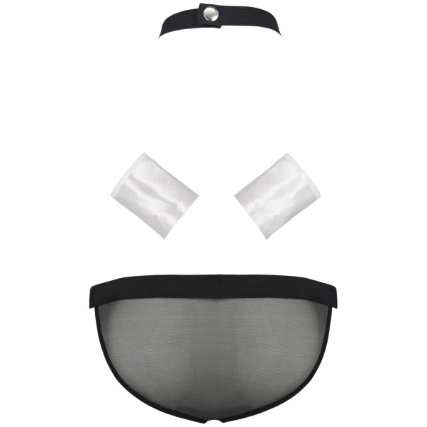 Tend to the needs of your darling while wearing the black collar, white cuffs and the I-mean-business triangle briefs. Do your job well, and your partner might just want to follow the row of bows on your bulge to thank you for your service.