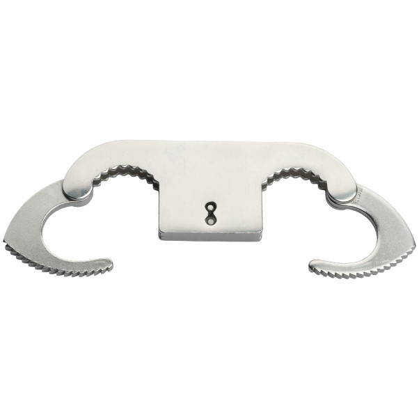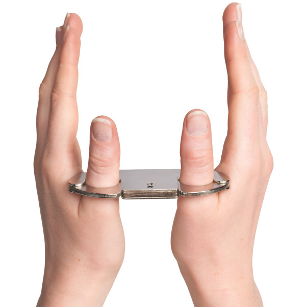 Slide the thumbs into the awaiting holes and rotate the two jaws until they engage the ratchets, and lock the two thumbs inside. The double-locked cuff effectively restrains but still keeps the eight other fingers free to touch and play with. How about daring the restrained to please you or to carry out seductive tasks?