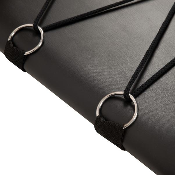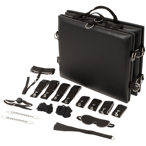 Use the many rings at either side and top of the board to attach the ropes and chains and, once your kinky play begins, introduce the included blindfold, handcuffs, gag ball, collar and flogger to fully immerse yourself in your BDSM session.